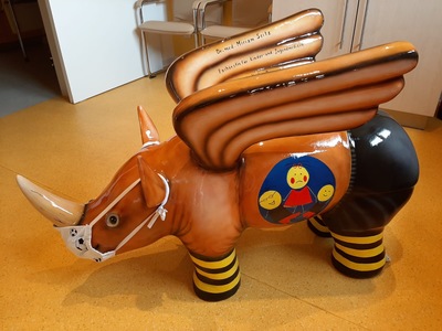 Bei Aki handelt sich es um ein beflügeltes Nashorn (Rhinoceros alatus), nachempfunden dem Wappentier des Dortmunder Konzerthauses und entstanden im Rahmen der Kunstaktion in der Dortmunder Innenstadt.