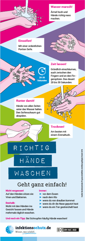 - gründliches und regelmäßiges Händewaschen (siehe Info Bild unten)
